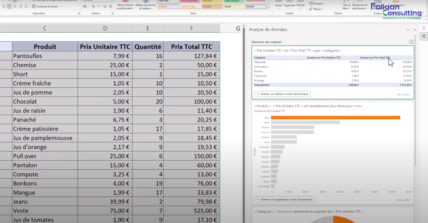 Vous pouvez aussi, à partir de chaque analyse, générer un tableau croisé dynamique ou un graphique, en cliquant simplement sur “Insérer un tableau croisé dynamique” ou “Insérer un graphique”. Excel insèrera instantanément le tableau croisé dynamique ou le graphique correspondant à vos données !